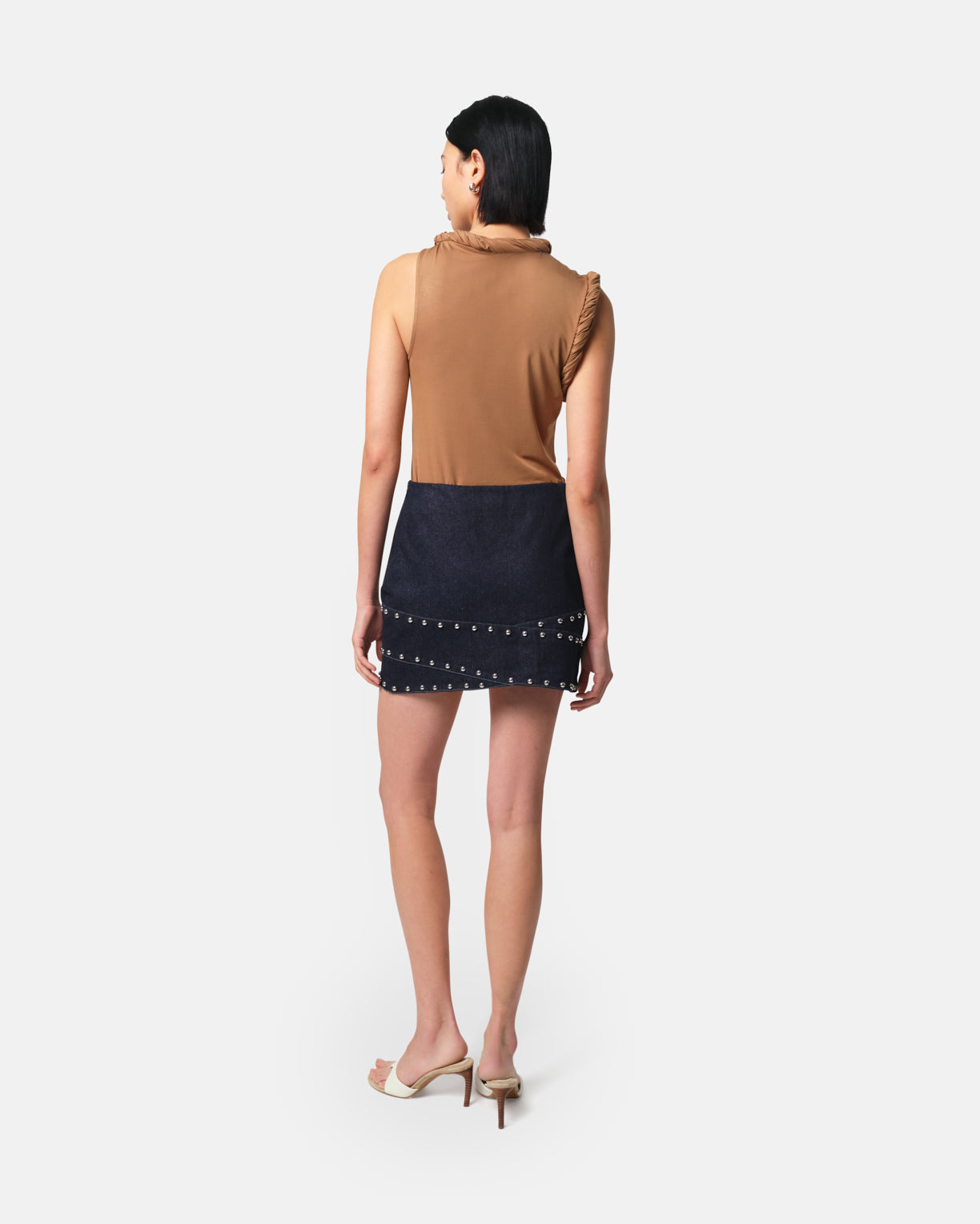 Mini skirt in rinsed denim featuring crossover panels studded with shiny silver domes.