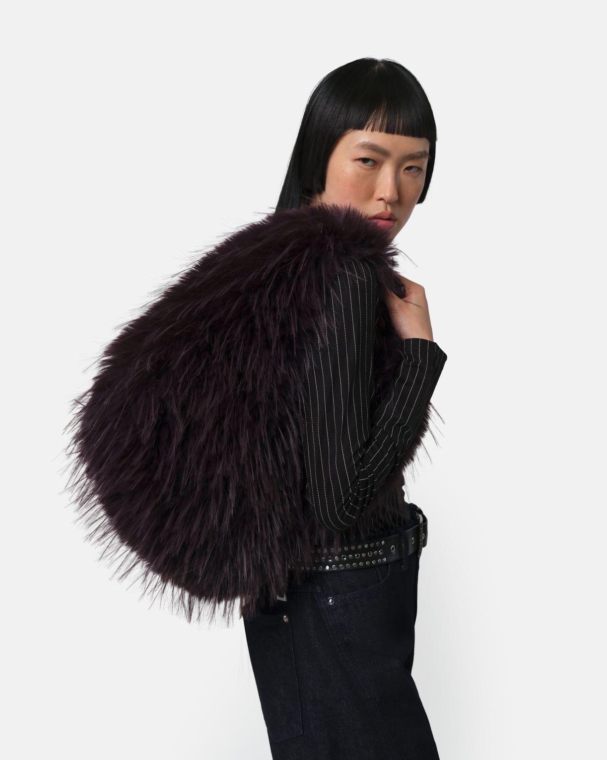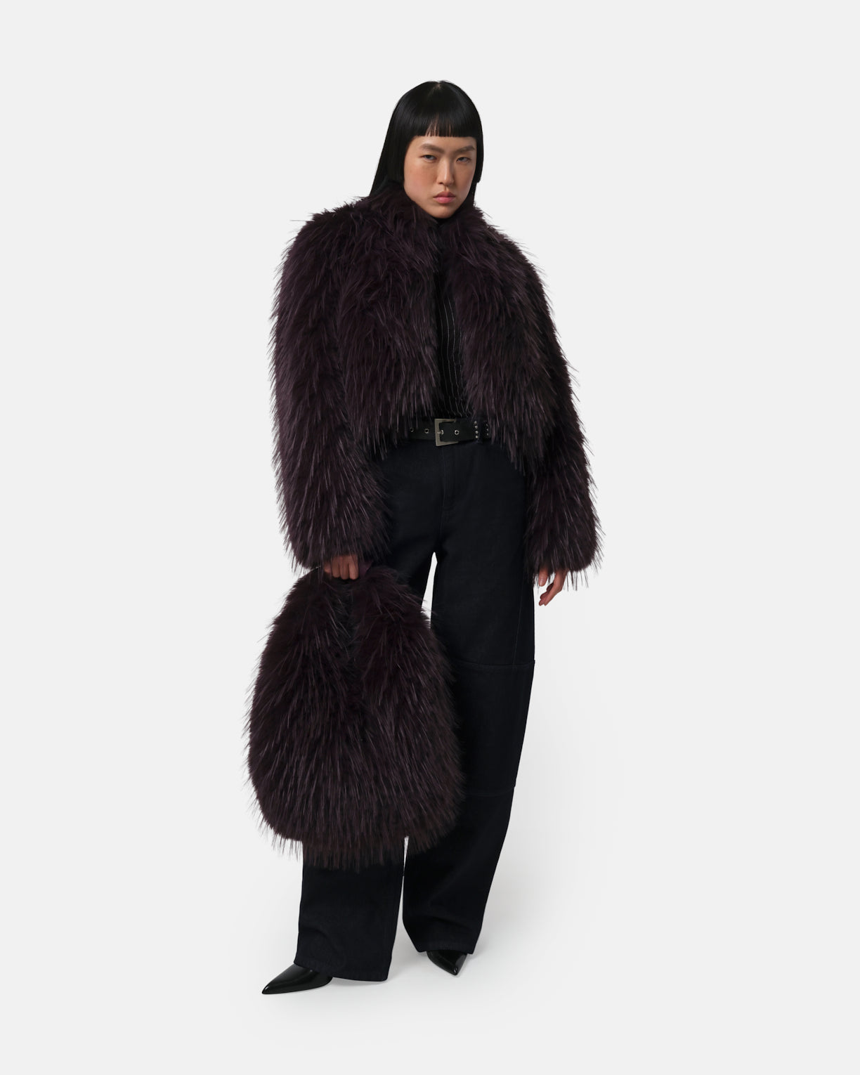 Recycled shag faux fur with a bonded, faux suede lining and detachable SANS Leather strap.