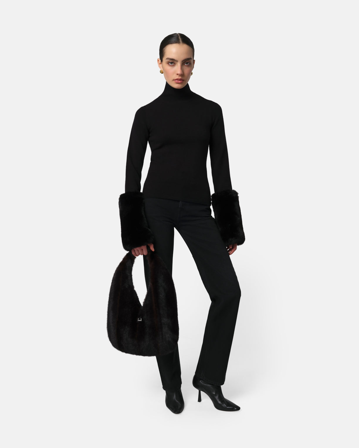 • Recycled shaved mink faux fur with a bonded, faux suede lining and detachable SANS Leather strap.