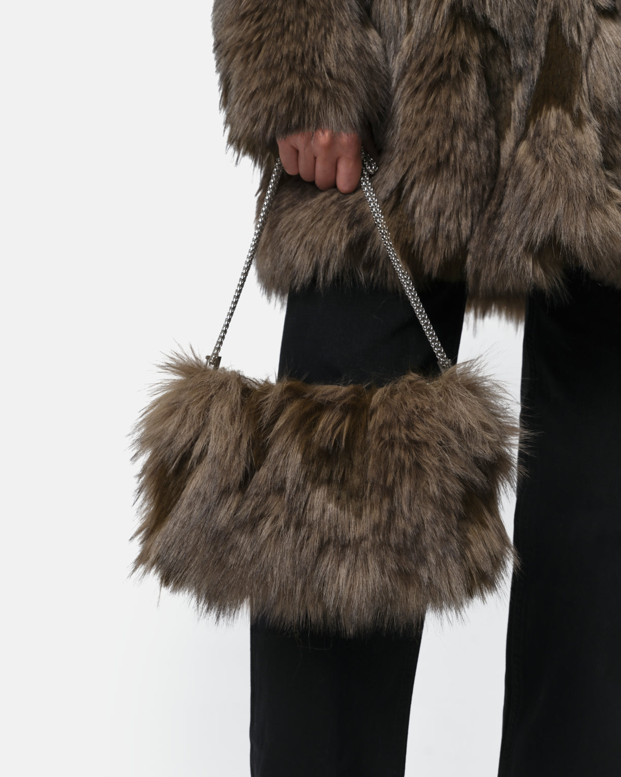 Recycled patchwork faux fur with a tonal, faux suede lining.