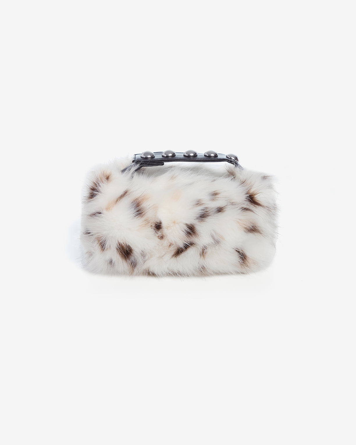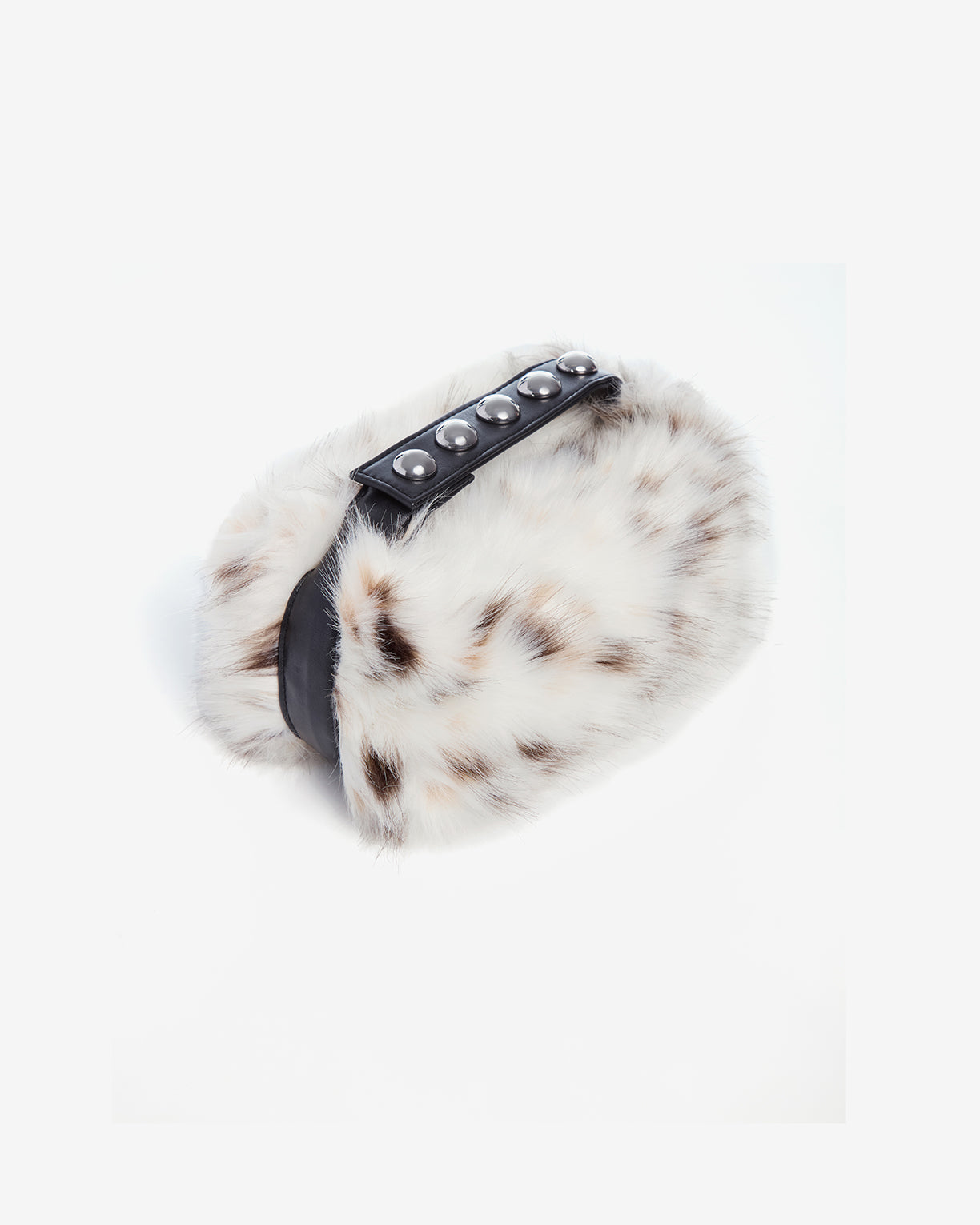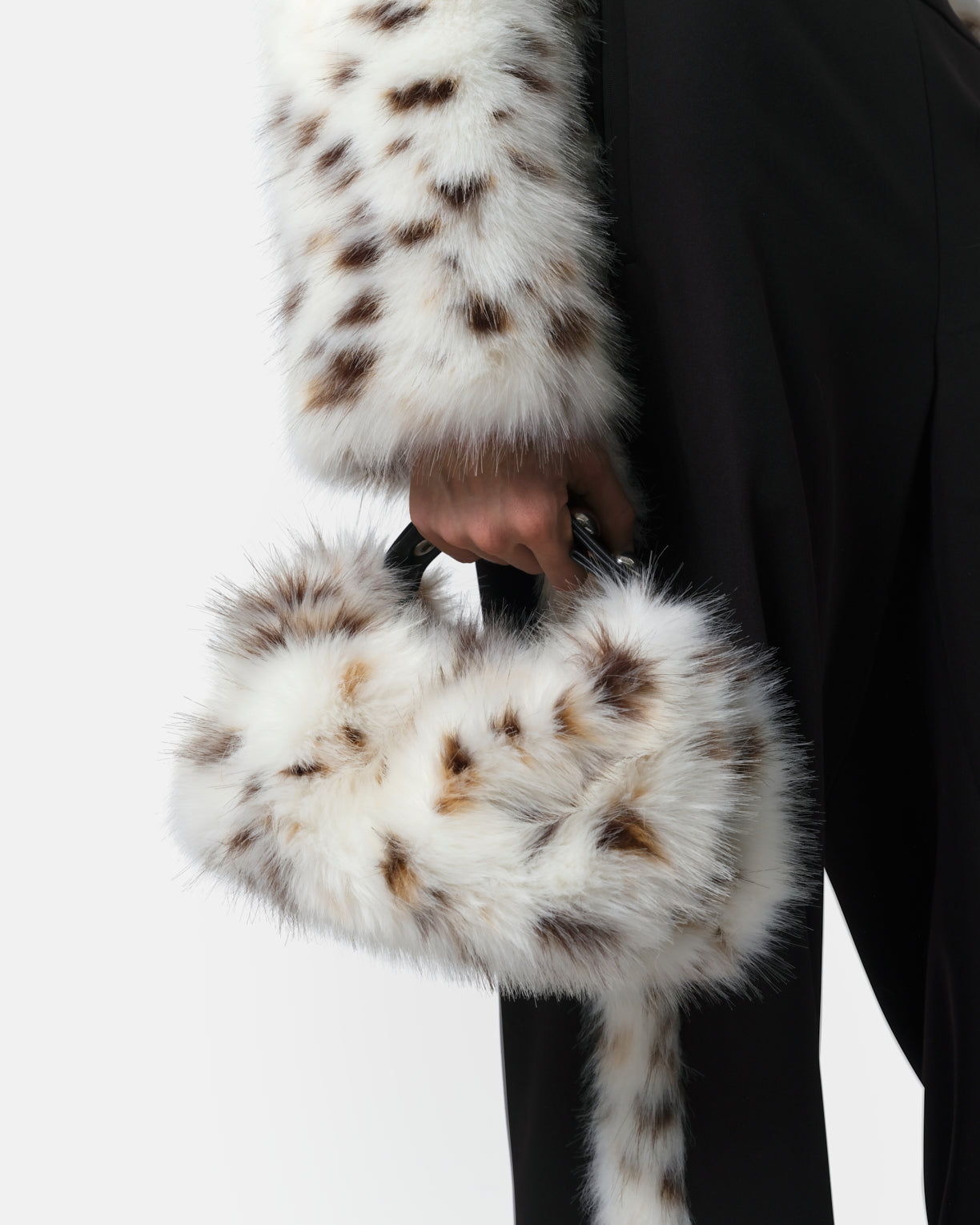 Recycled faux snow leopard sable fur with a 100% recycled poly lining & partially recycled, custom metal trims.