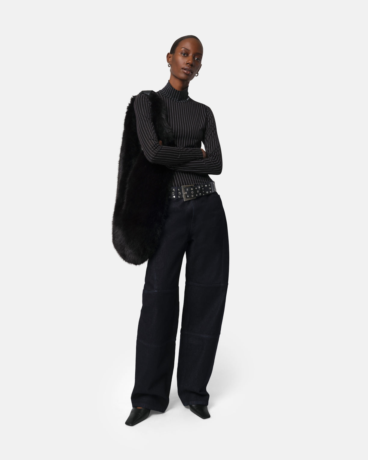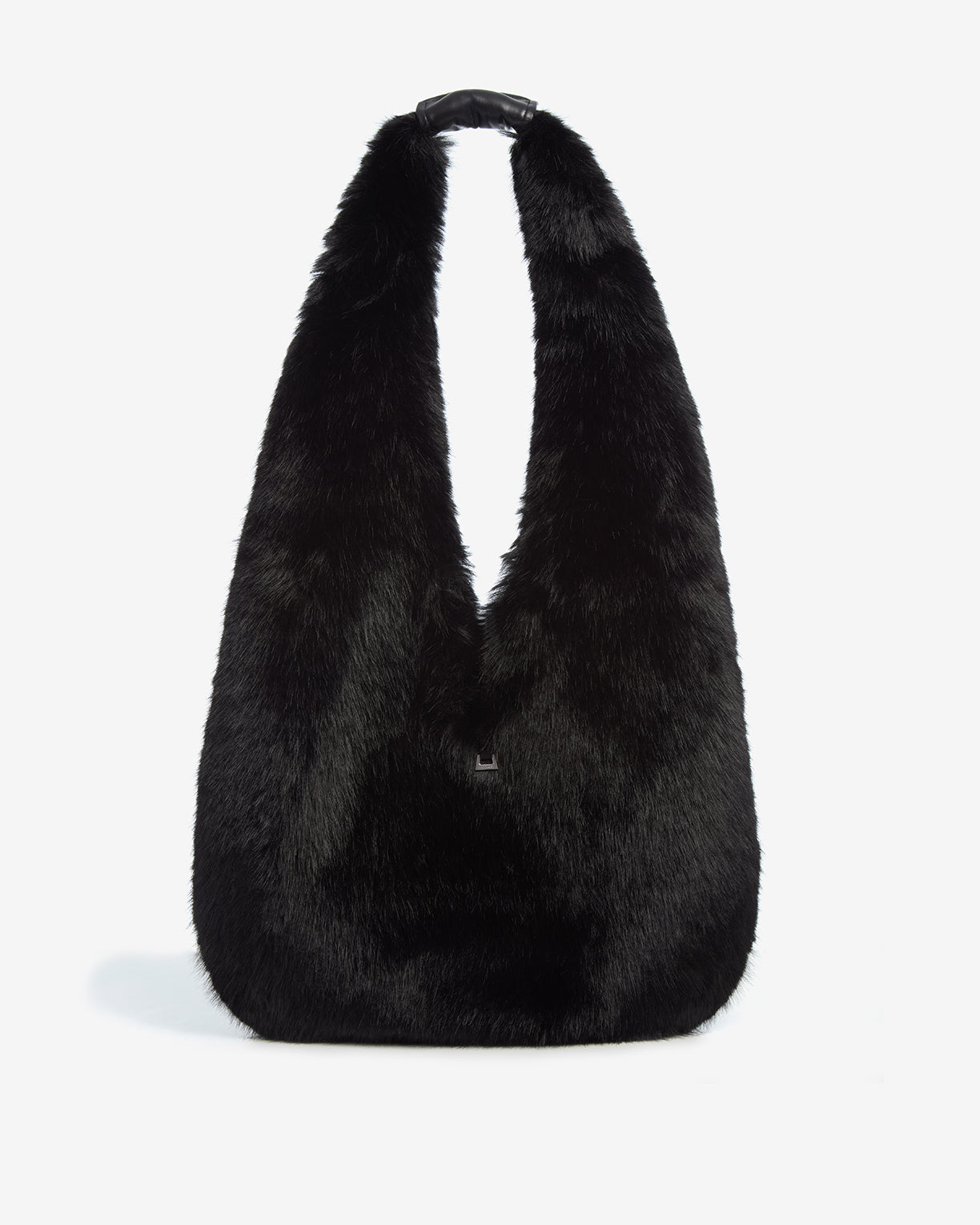 Recycled sable faux fur with a bonded, faux suede lining and detachable SANS Leather strap.