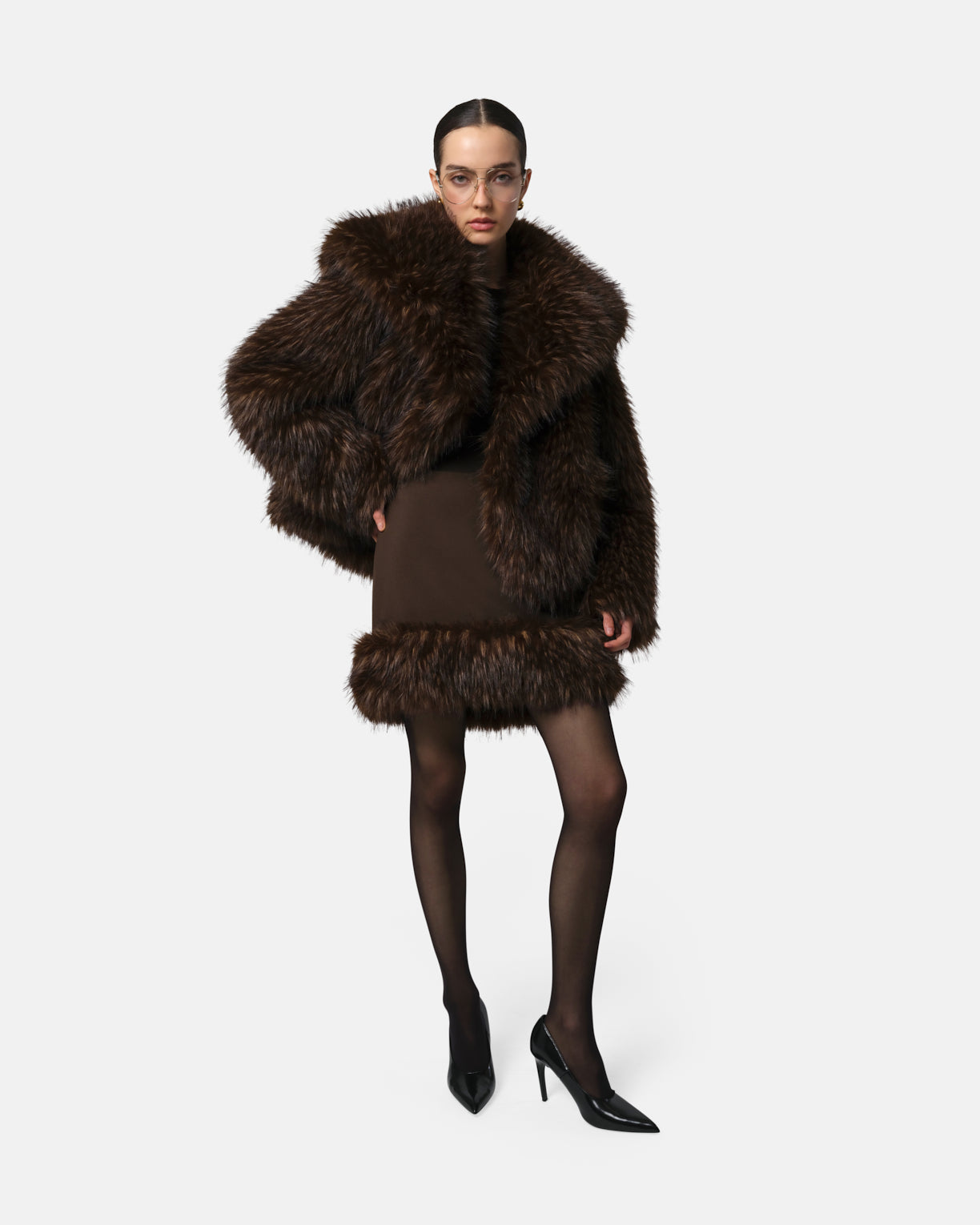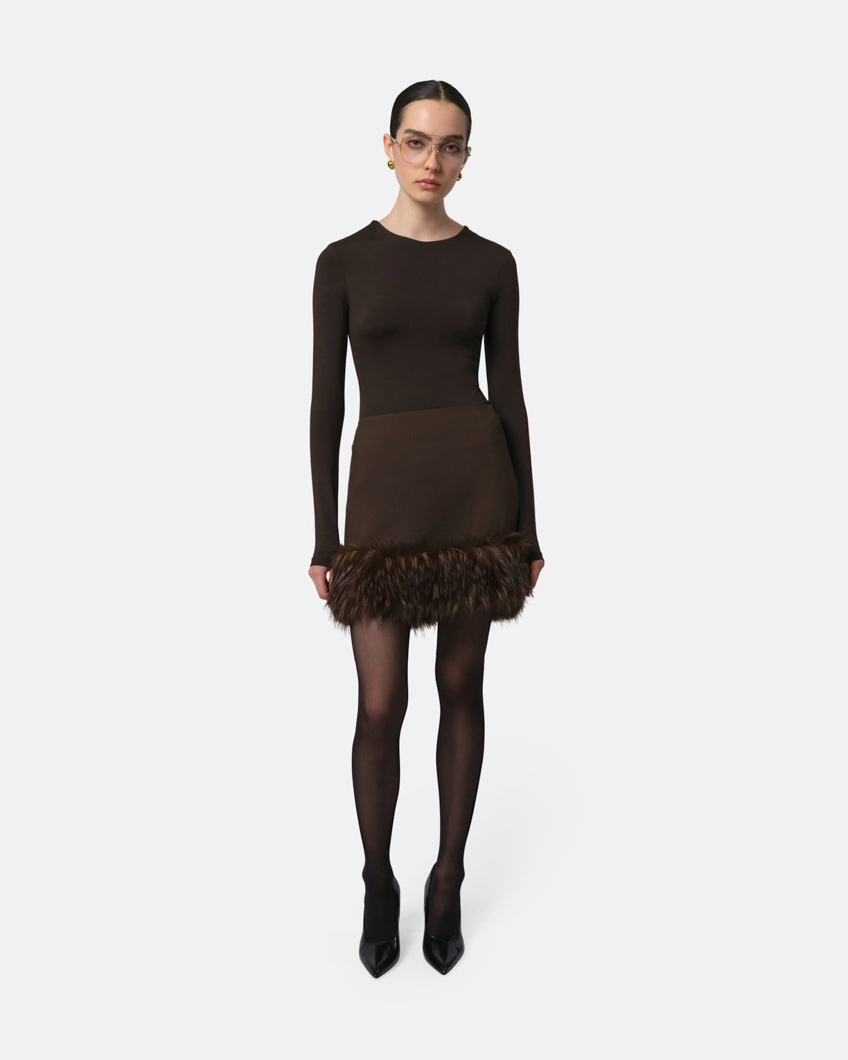 Stretch crepe mid rise mini skirt with tipped fox faux fur trim.