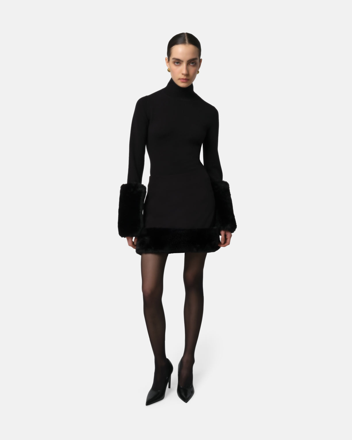 Stretch crepe mid rise mini skirt with recycled extra PLUCHE™ faux fur trim.