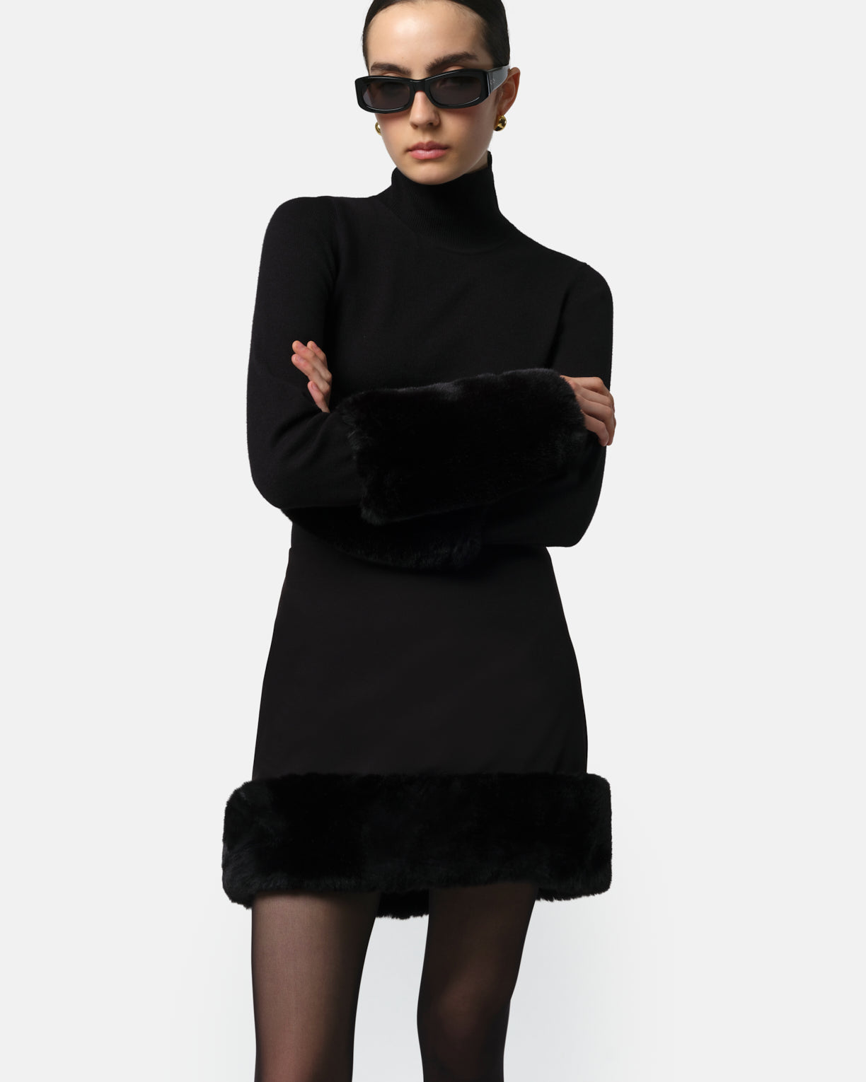 Stretch crepe with recycled PLUCHE™ faux fur trim.