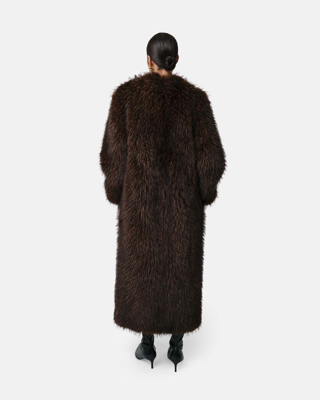 Tipped fox faux fur maxi coat with SANS leather metal buckles.