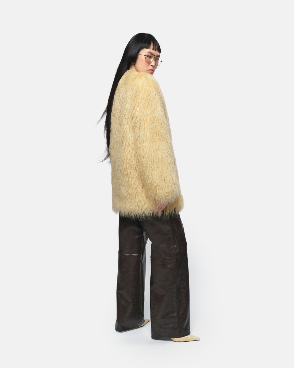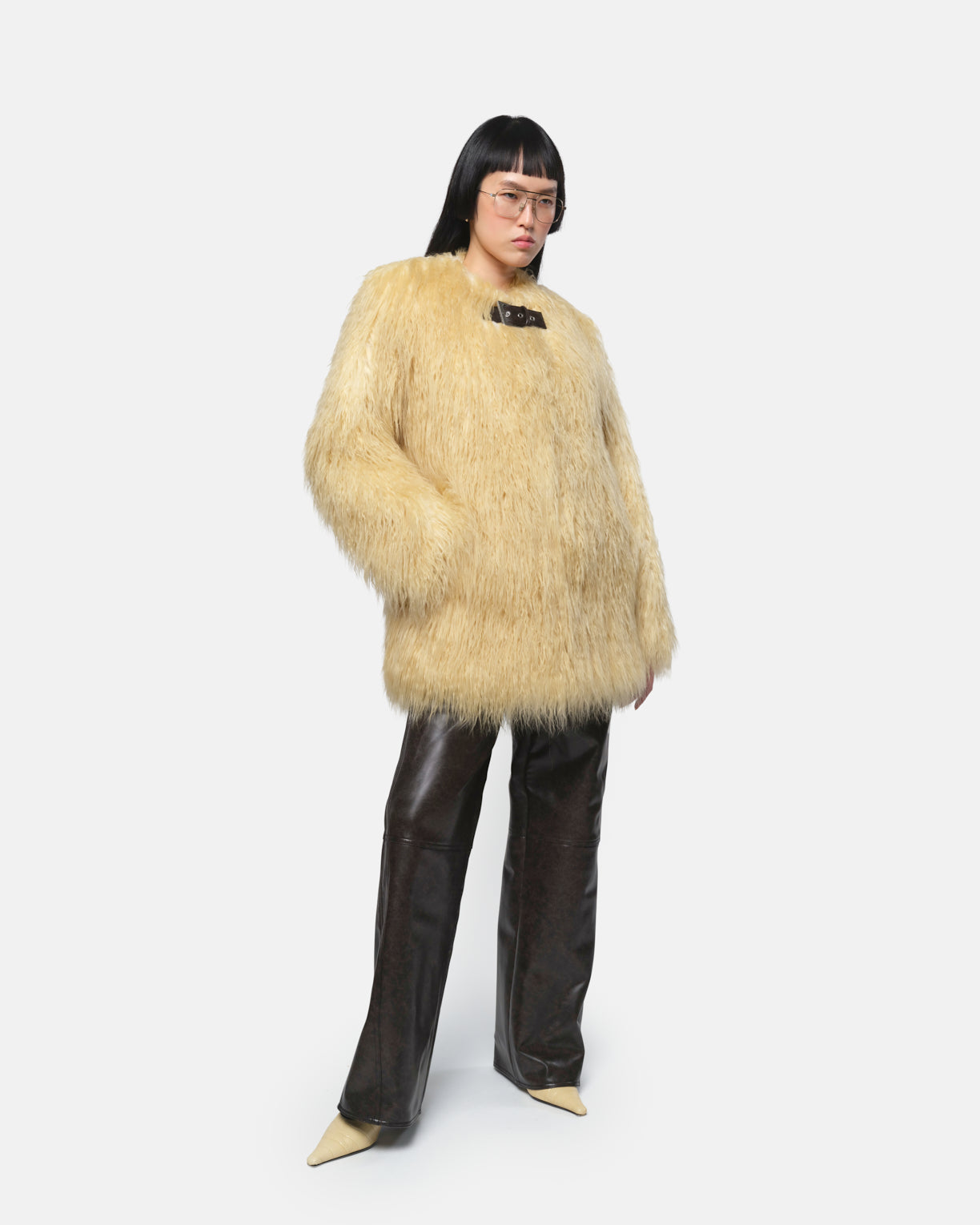 Faux Mongolian fur coat.