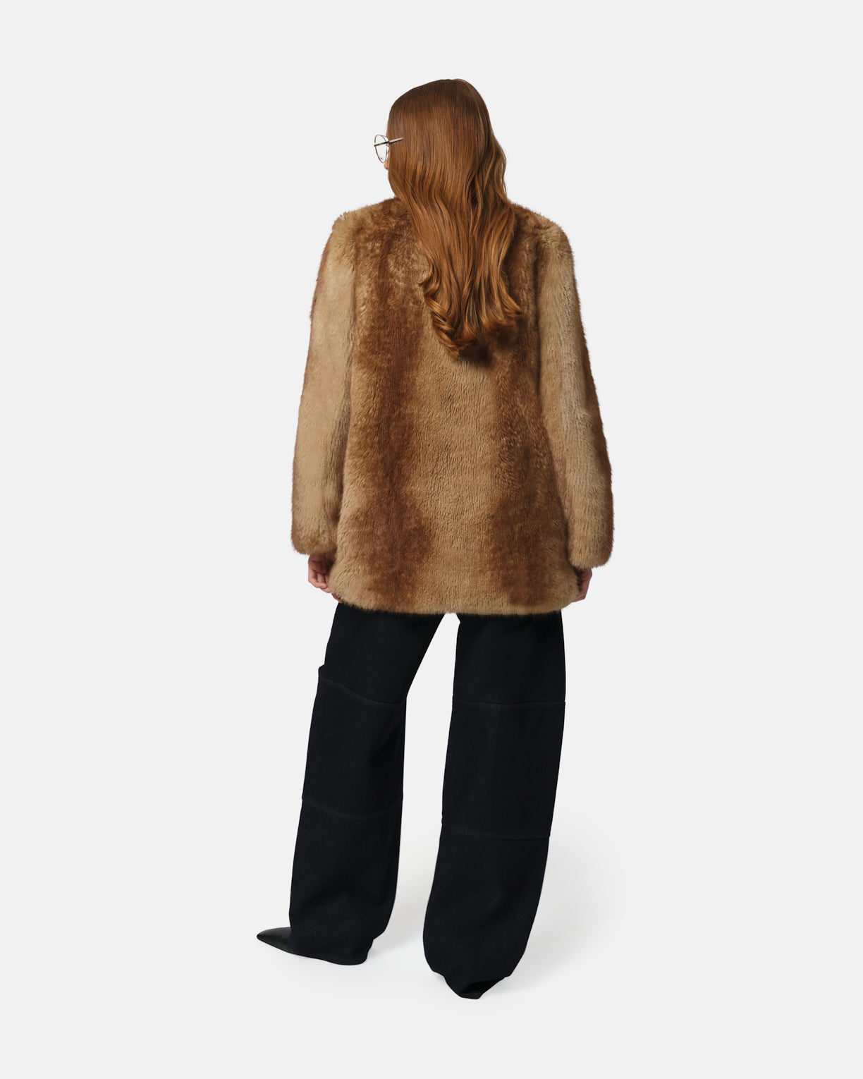 Recycled faux mink fur with a SANS leather strap and silver buckle closure.