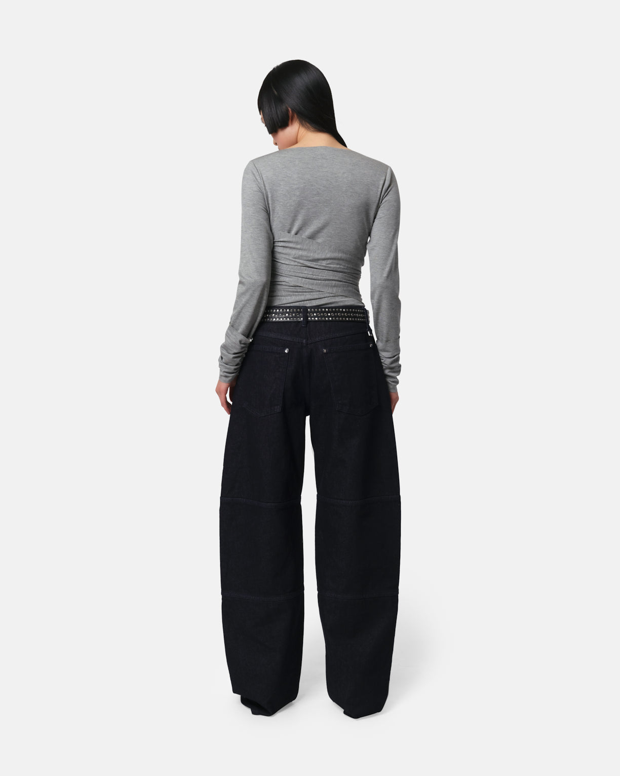 Barrel jeans in raw denim with patch details.