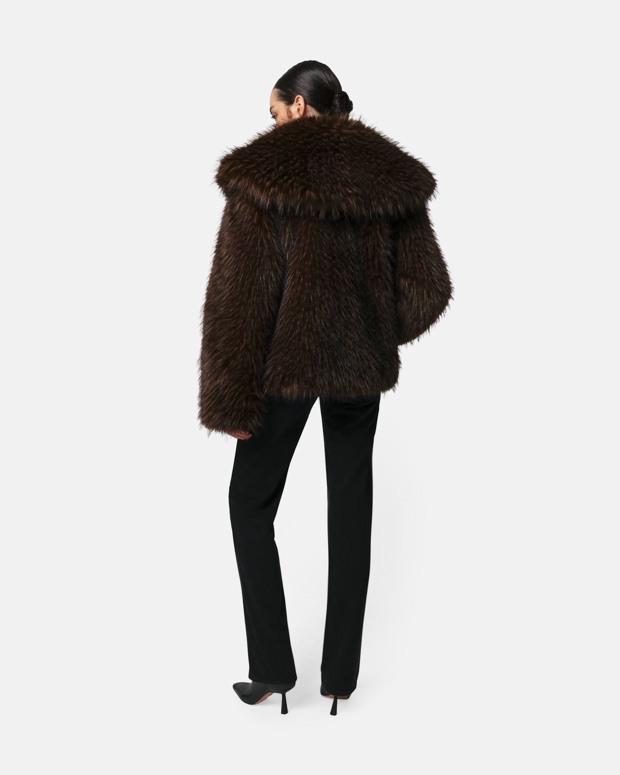 Tipped fox faux fur short coat with an exaggerated shawl collar.
